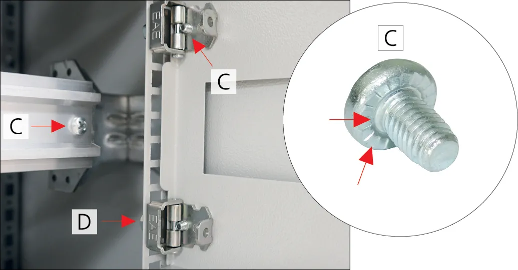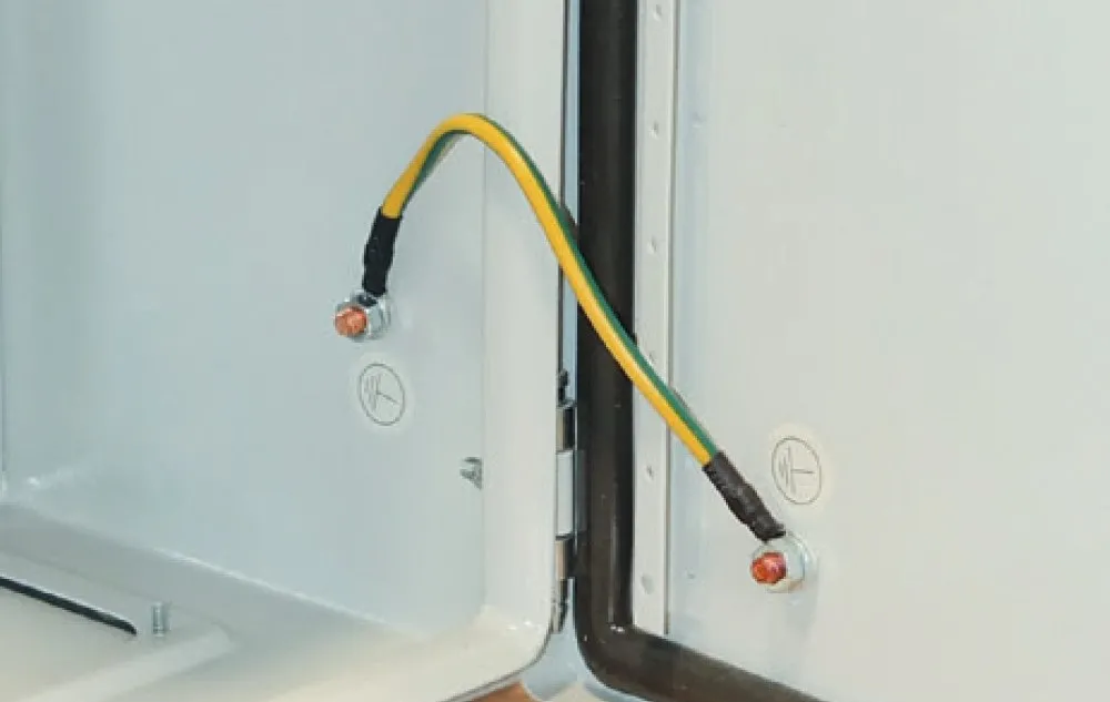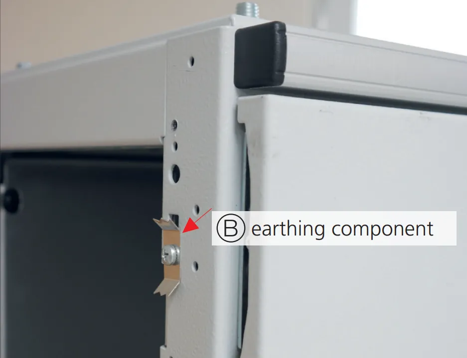 With regard to the inclusion of the door and side panel in the protection measures for “Protection in case of indirect contact” connection of a separate earth conductor to the door or side panel is recommended, when an apparatus is attached on them and the rated operational current of the attached apparatus is higher than 16 A. The applicant must determine whether or not the integrated contacting is sufficient for the earthing system. Attention is here drawn to the regulations and standards. EAE enclosure doors are supplied with 6 mm² cross-section earthing cable for attached apparatus rated current up to 63A.