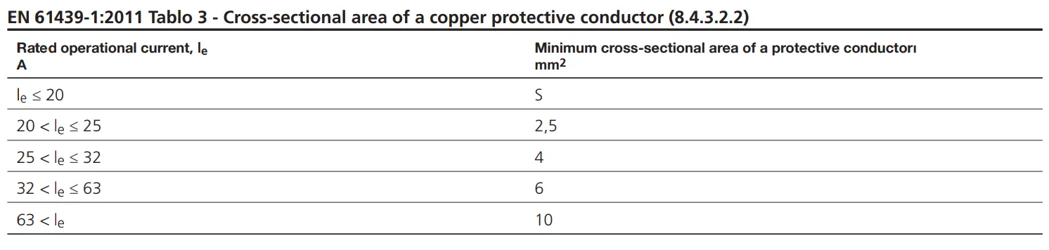 Exposed conductive parts of a device that cannot be connected to the protective circuit by the fixing means of the device shall be connected separately to the protective terminal of the enclosure by a conductor whose cross-sectional area is chosen according to EN 61439-1 Table 3.